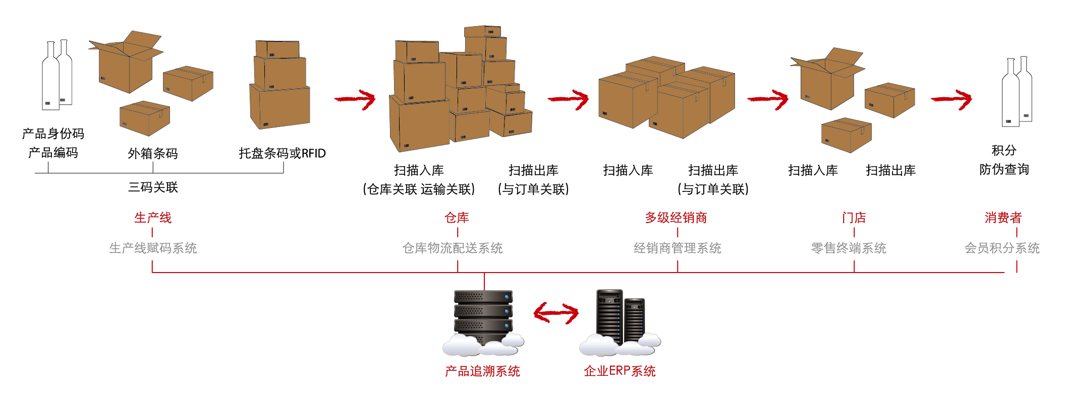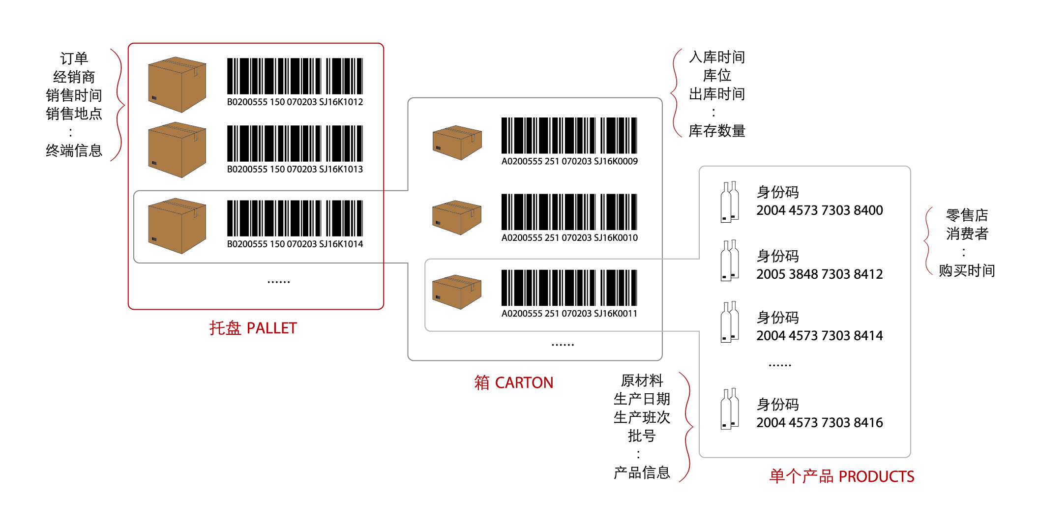 给产品赋上身份码,从小单元的身份数据开始,在各级包装码之间建立关联关系,给后续的物流追踪、互动营销提供基础数据。
